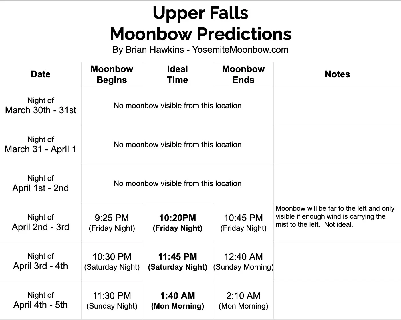 Moonbow predictions and moonbow viewing schedule for Lower Yosemite Fall in Yosemite National Park.  March 31, 2026 at 8:30pm; April 1, 2026 at 9:00pm; April 2, 2026 at 10:45pm; April 4, 2026 at 12:15am; April 5, 2026 at 1:30am.